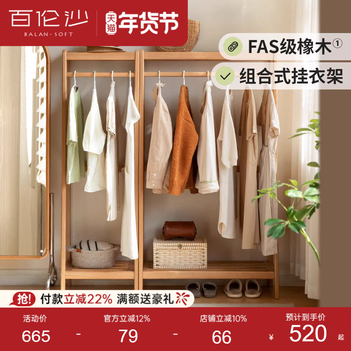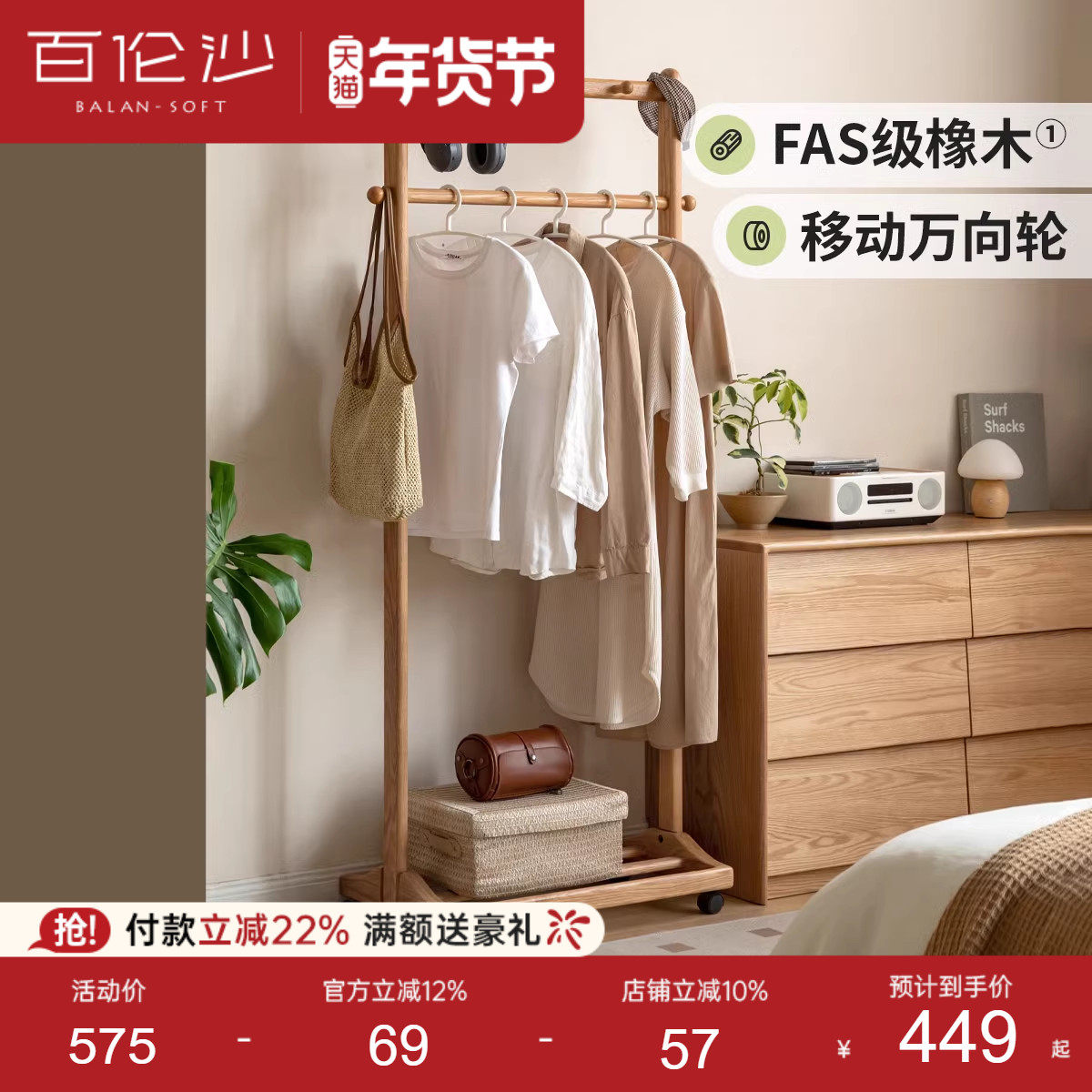 源氏木语百伦沙实木挂衣架卧室橡木衣帽架现代简约落地收纳置物架