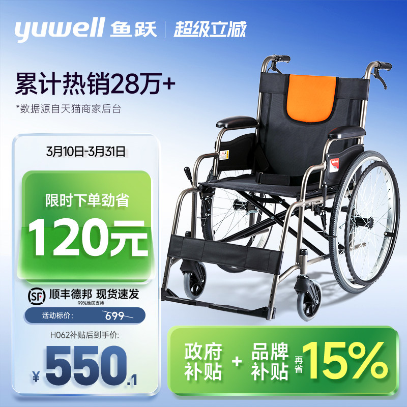 鱼跃轮椅车折叠轻便瘫痪老人专用坐便代步年轻人骨折手动推车H062