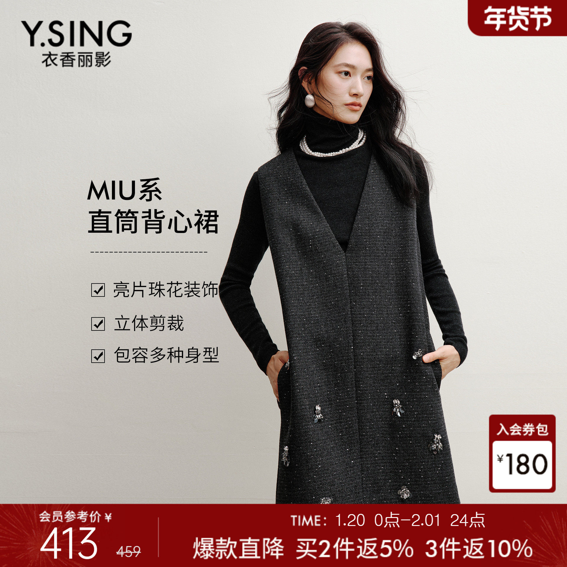 衣香丽影灰色亮片毛呢背心连衣裙女2025冬装新款无袖直筒羊毛裙子