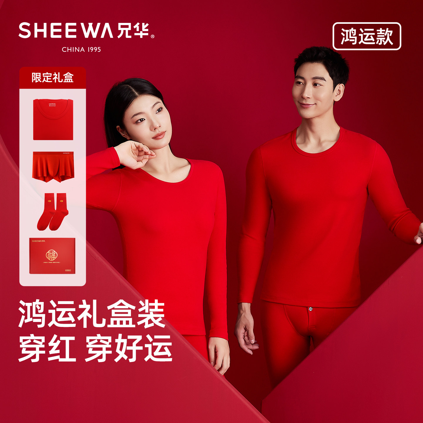 兄华男士圆领本命年加厚纯棉保暖内衣套装女秋衣秋裤大红结婚礼盒