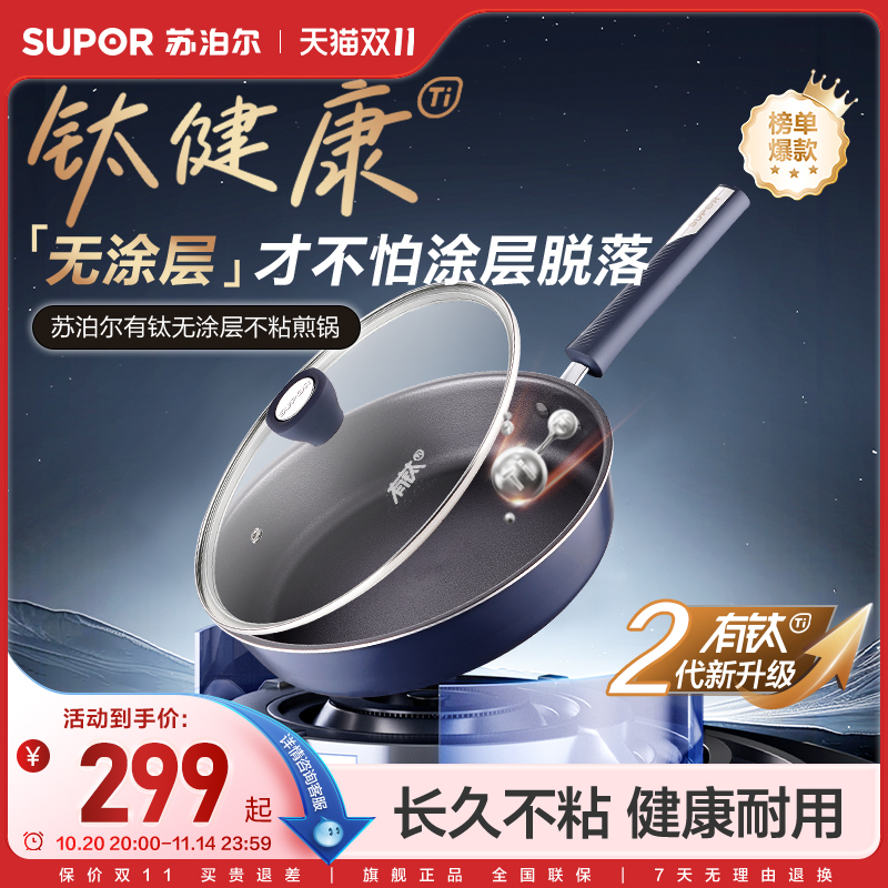 苏泊尔纯钛无涂层煎锅家用煎蛋神器平底锅不粘锅牛排煎锅炉灶通用