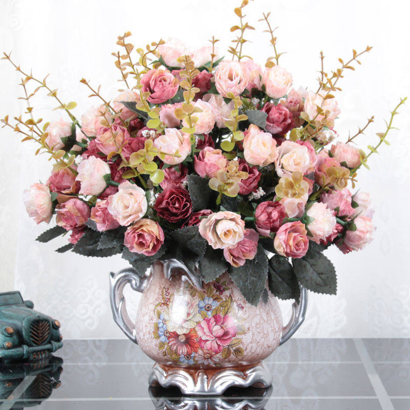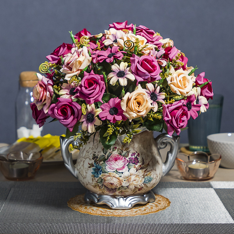 客厅仿真花套装假花装饰绢花玫瑰餐桌摆件盆栽欧式花瓶插花艺摆设