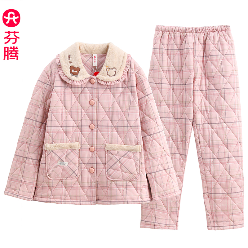 芬腾春秋冬季新款睡衣女人三层薄夹棉甜美可爱纯棉加厚全棉家居服