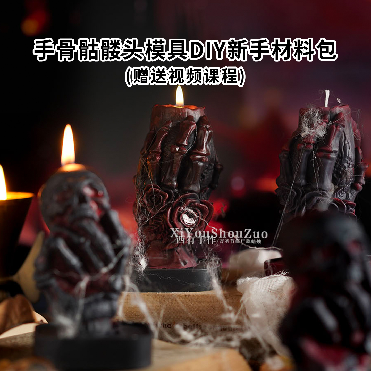 万圣节骷髅头香薰蜡烛硅胶模具 diy团建节日手骨材料包送视频教程
