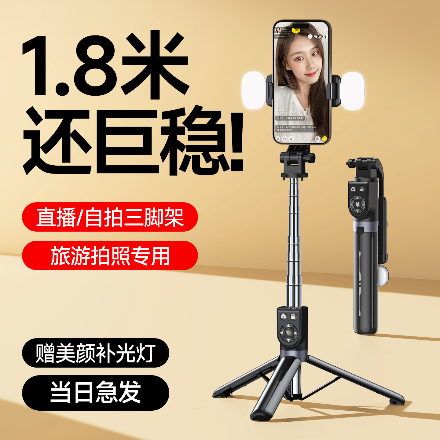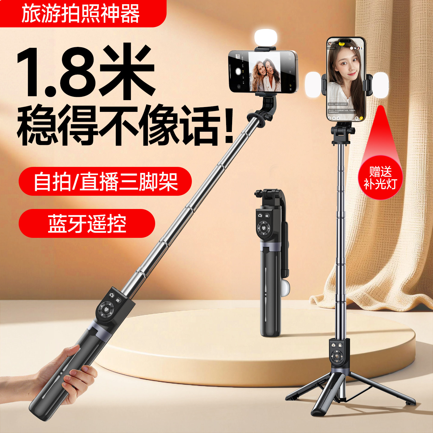 2026新款手持自拍杆落地三脚架补光灯手机拍照神器360度旋转便携旅游直播蓝牙遥控伸缩万能通用网红手机支架