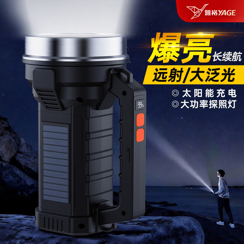 雅格太阳能充电手电筒强光远射超亮耐用巡逻超长续航探照灯手提灯