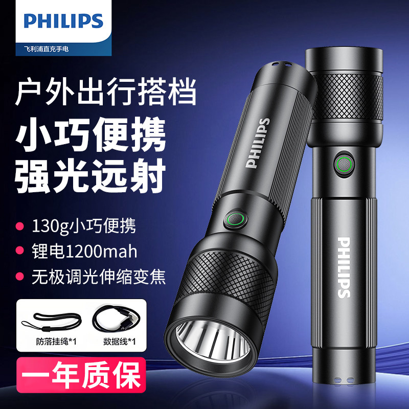 飞利浦手电筒强光超亮充电超长续航家用户外应急便携多功能小手电