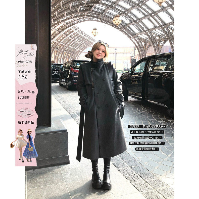 安妮不火 格雷系双排扣毛呢外套女2025秋冬新款微胖大码呢子大衣