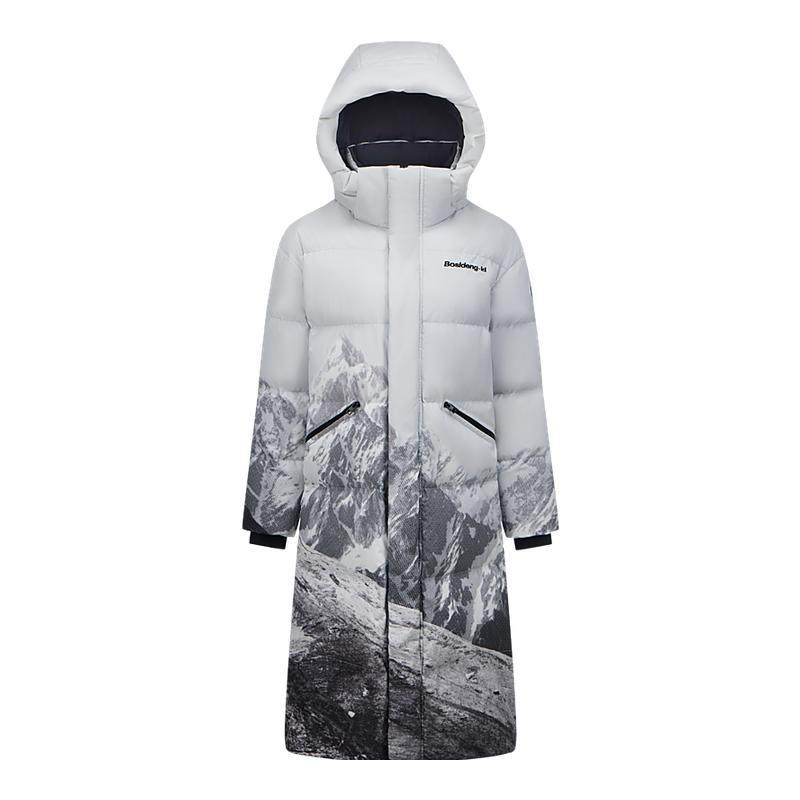 波司登奥莱冬男女同款水墨山水时尚运动雪山图案长款连帽厚羽绒服