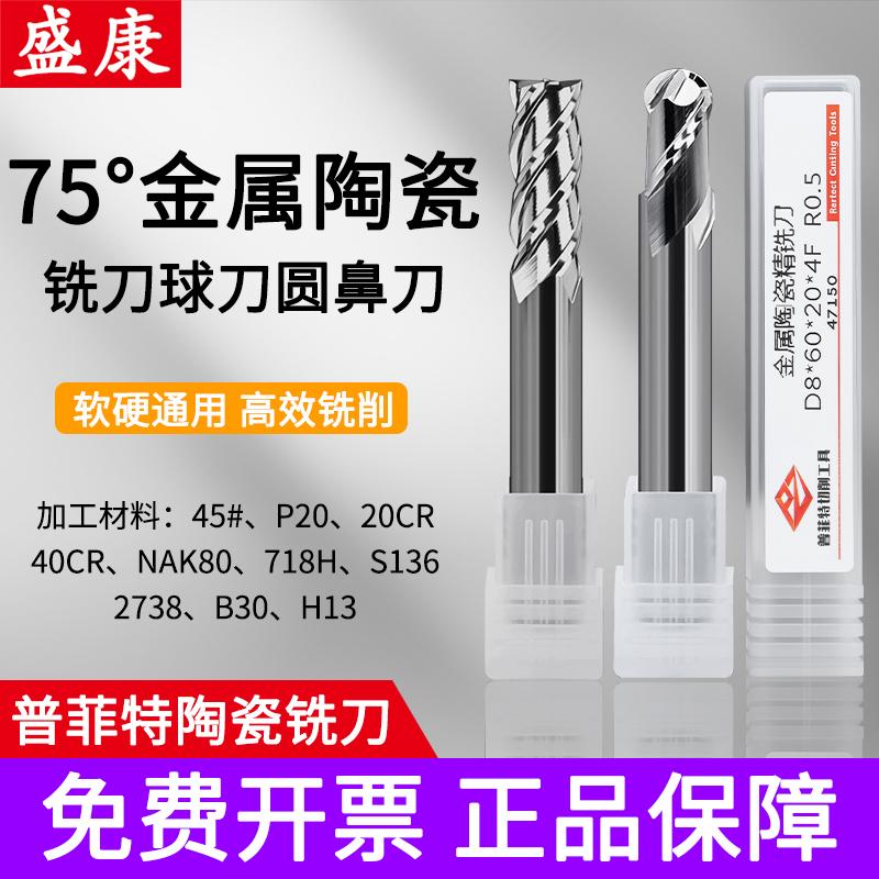 普菲特75度金属陶瓷铣刀圆鼻刀2刃球刀精加工高光镜面效果4刃铣刀