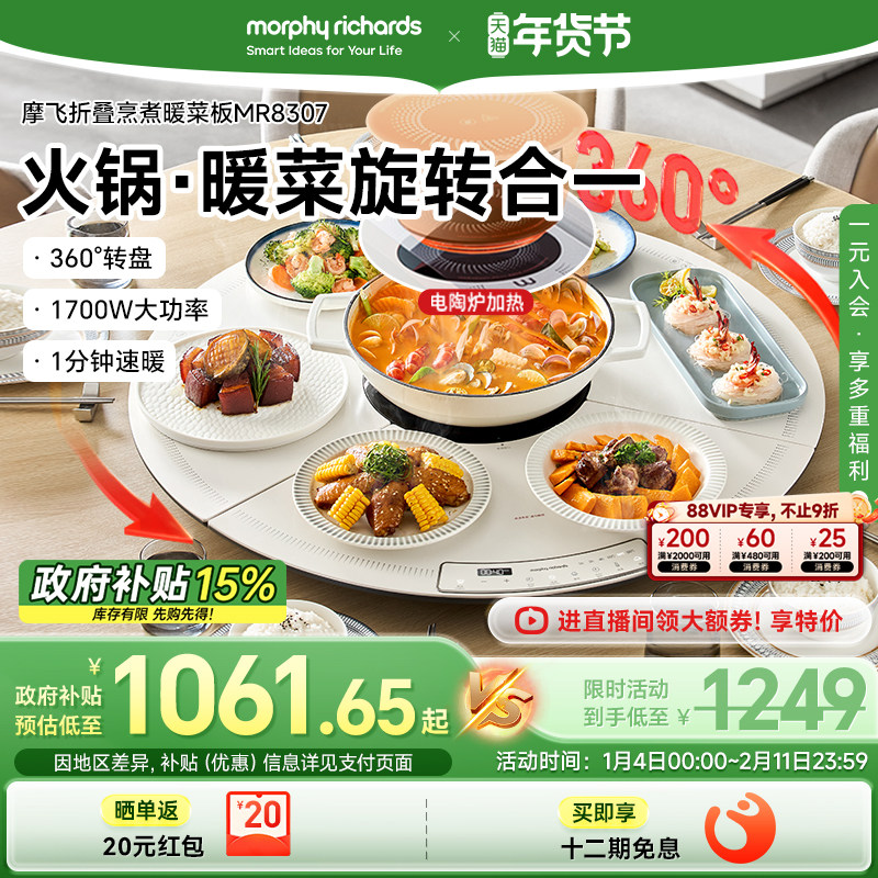 摩飞折叠暖菜板可旋转圆形MR8307家用餐桌转盘保温垫加热饭菜神器