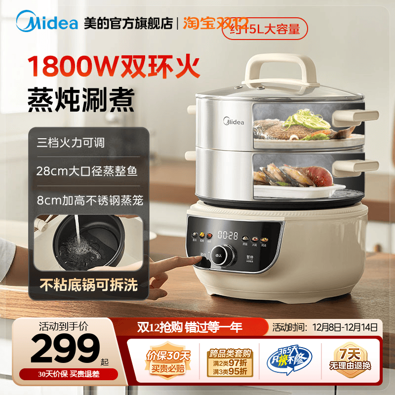美的电蒸锅多功能蒸煮一体锅火锅煮锅家用不锈钢蒸汽锅蒸菜电蒸笼