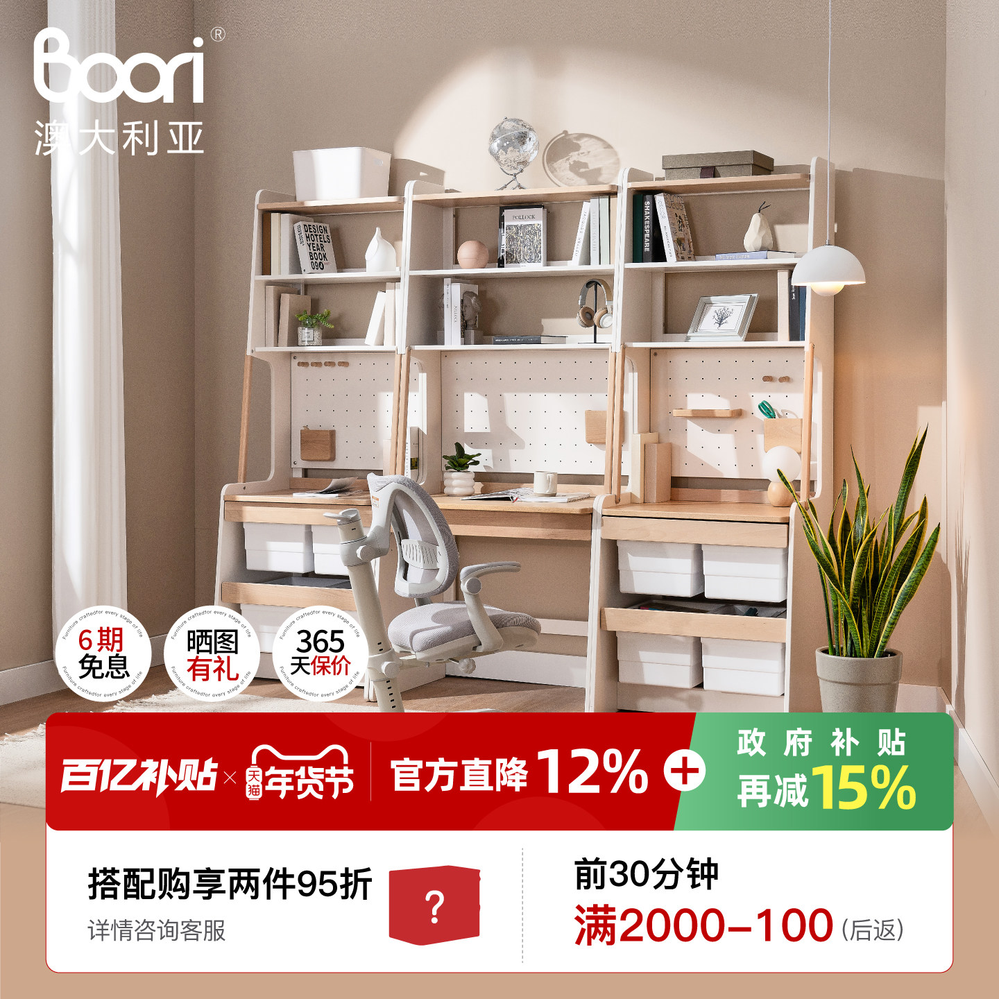 Boori实木书桌书架一体学习桌儿童家用写字桌学生课桌储物柜书柜