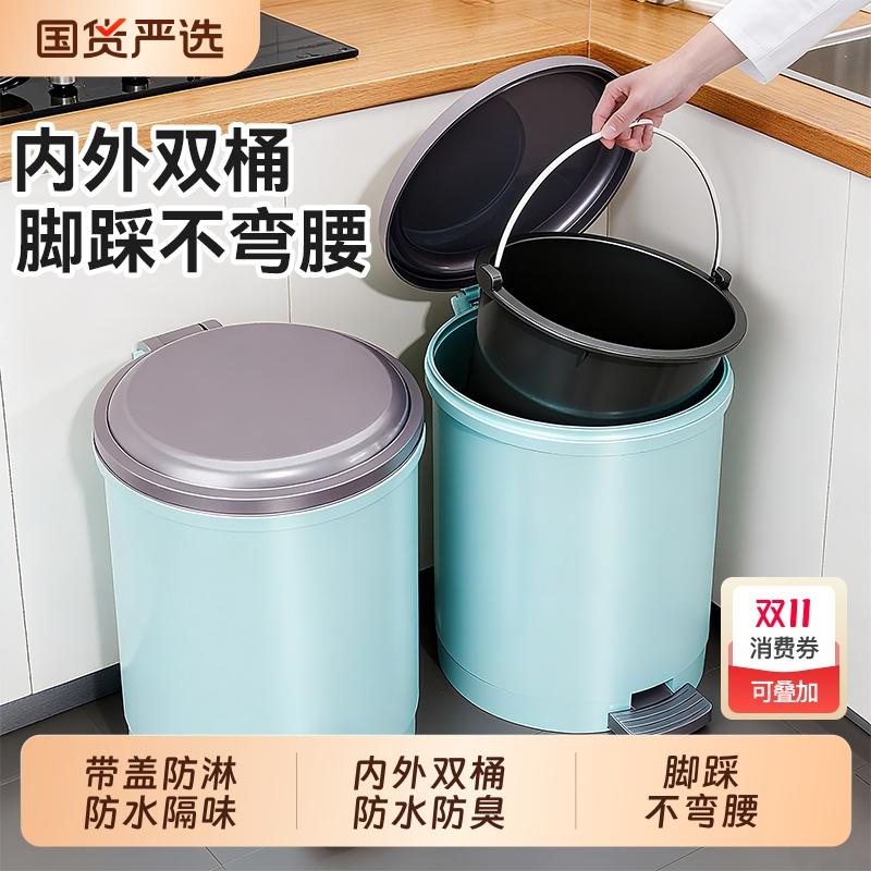 茶花双层脚踏垃圾桶大小号脚踩带盖卫生间厕所卧室内筒客厅拉级桶