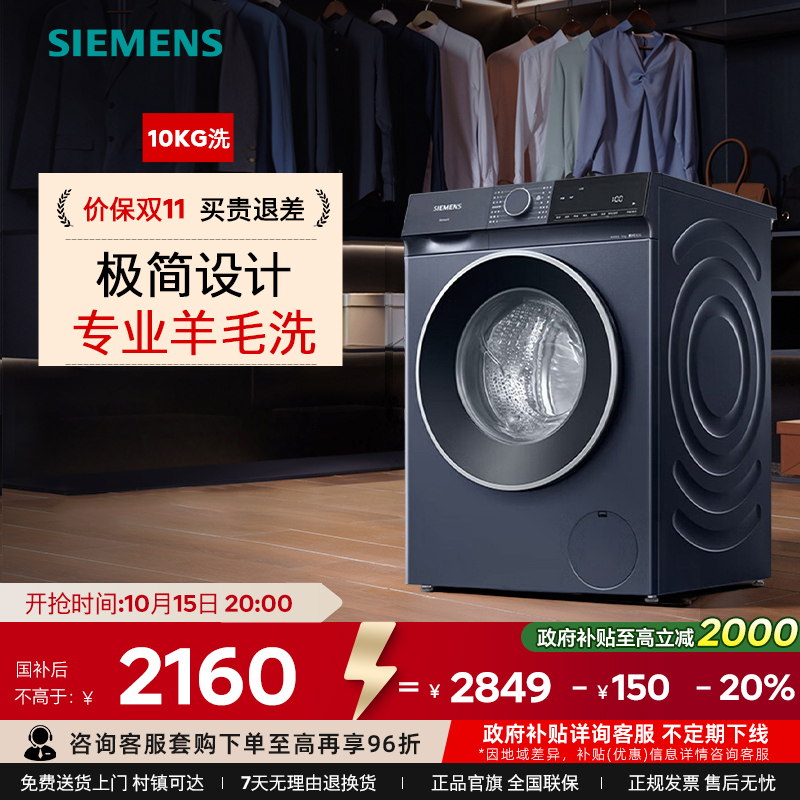 西门子10公斤智能除渍羊毛洗滚筒洗衣机家用大容量全自动变频1U10