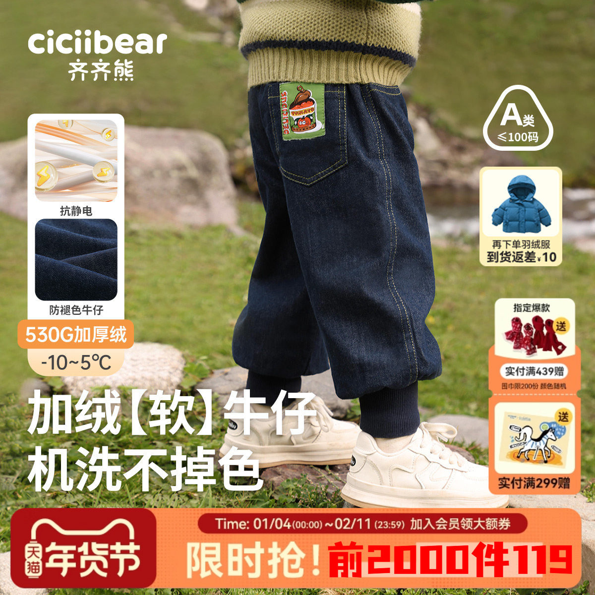 [户外耐磨不掉色]齐齐熊男童裤子儿童秋冬款加绒长裤宝宝牛仔裤女