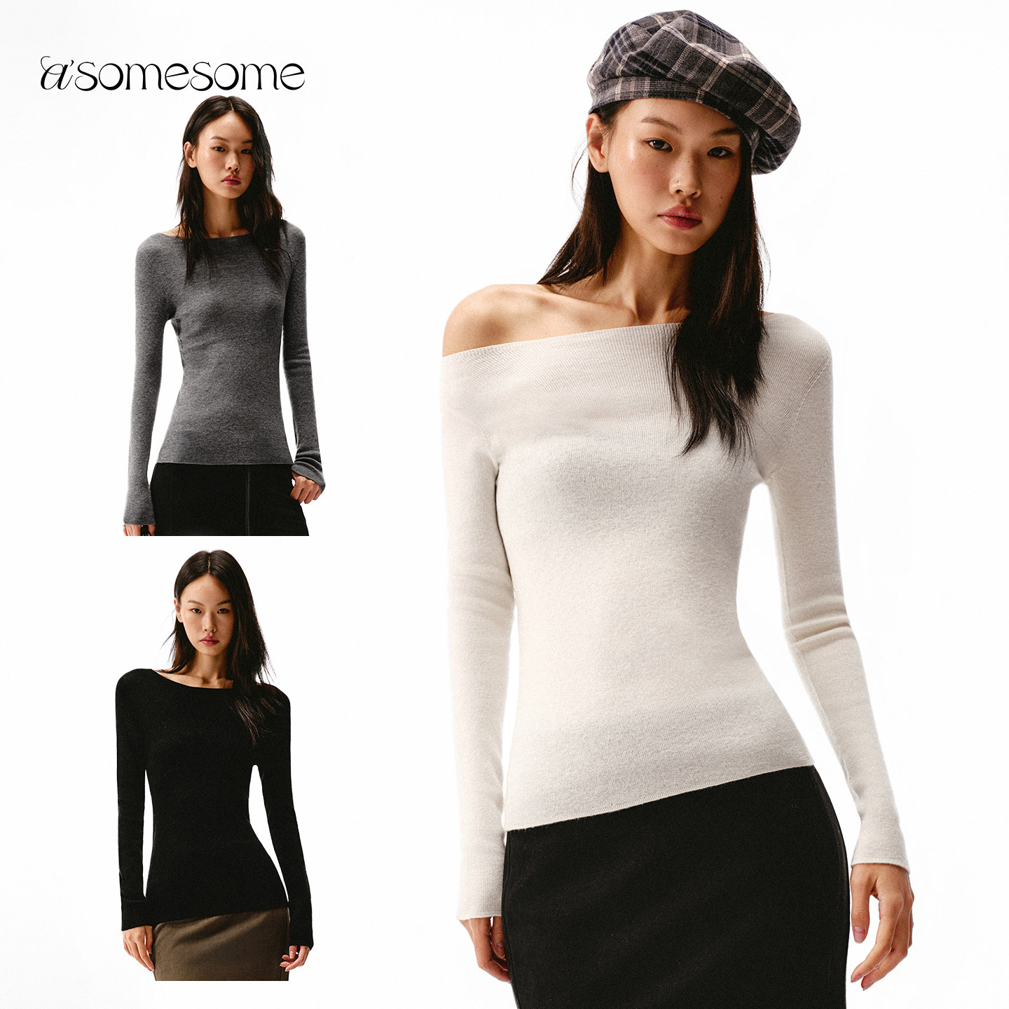 asomesome全羊毛亲肤针织打底衫女秋冬一字肩毛衣修身内搭上衣