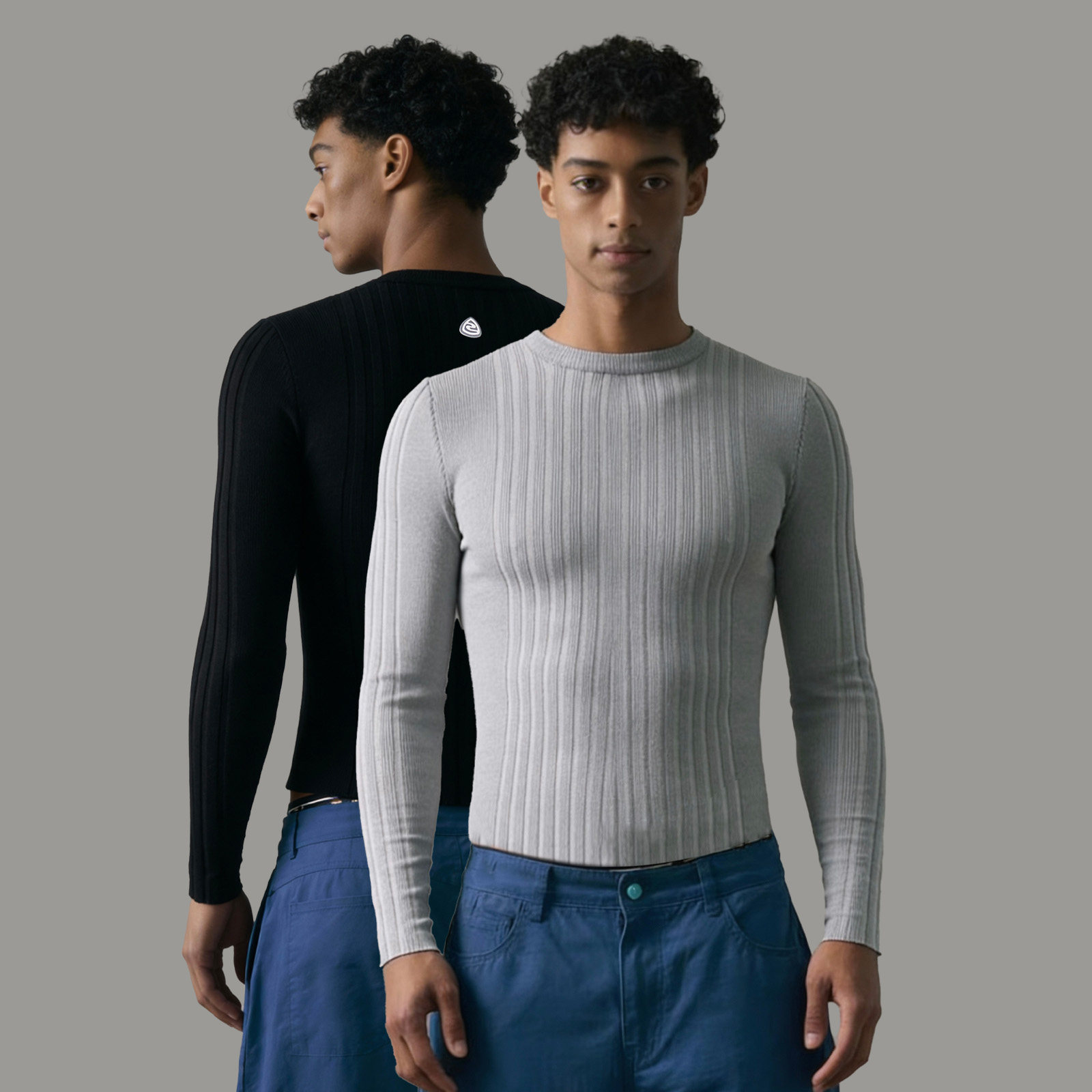 s45坑条肌理条纹修身罗纹针织衫基础纯色圆领长袖打底衫毛衣男女