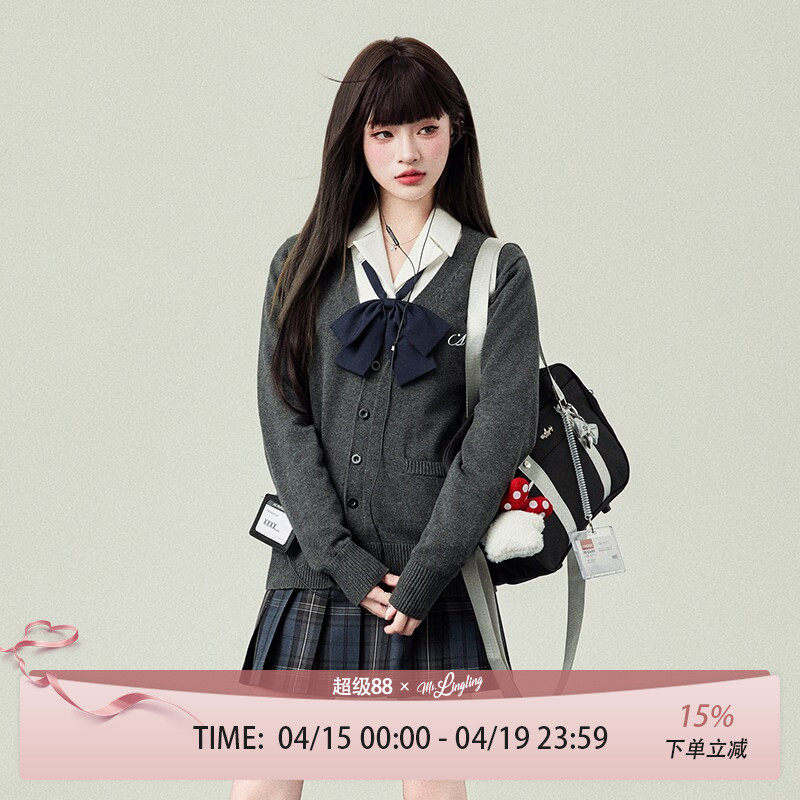 花铃太太针织衫深灰早春季节针织开衫女jk风修身显瘦毛衣v领外套
