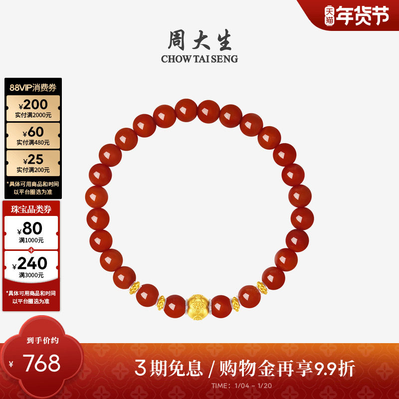 周大生黄金手链和田玉手串足金转运珠骐骥红玛瑙喜柿连连新年礼物
