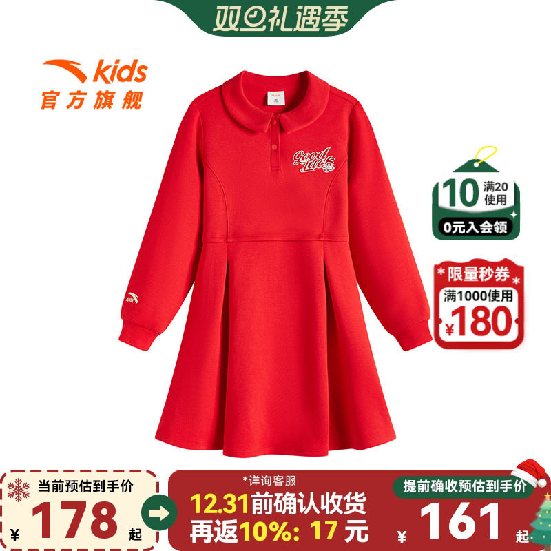 安踏儿童女大童针织连衣裙2026春季新款舒适百搭中大童红色长袖裙