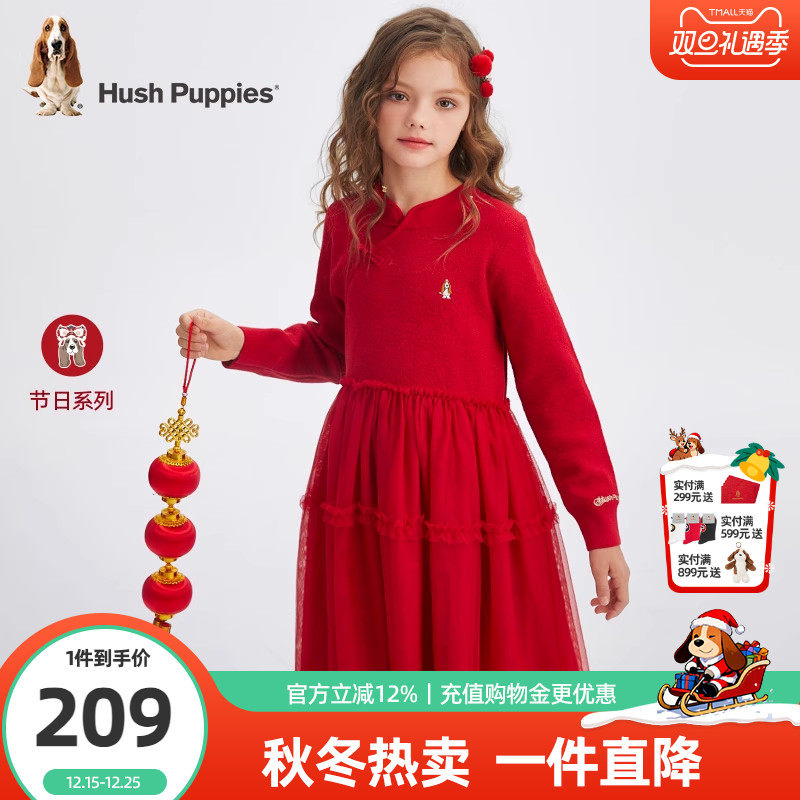 暇步士童装女童连衣裙秋冬新款儿童中国风长袖裙中大童休闲网纱裙