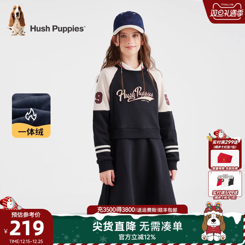 暇步士童装女童加绒连衣裙秋冬装新款大童复古长袖儿童休闲卫衣裙