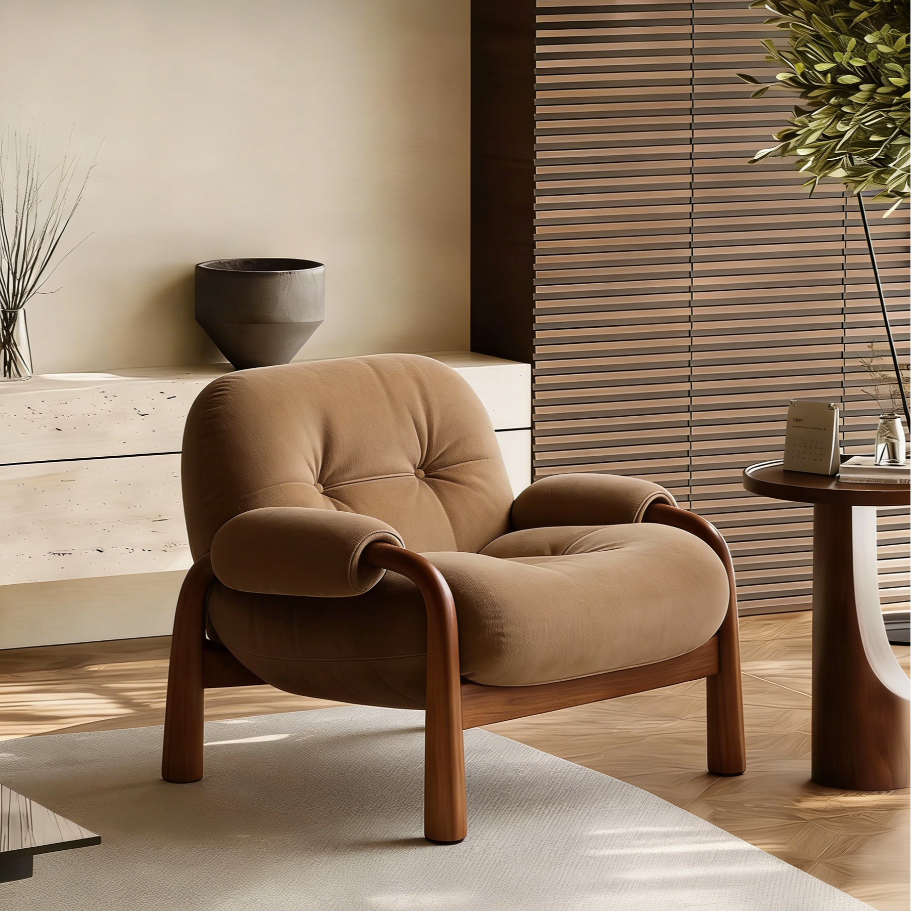 侘寂风实木单人沙发椅中古风单椅设计师胡桃木休闲客厅沙发靠背椅