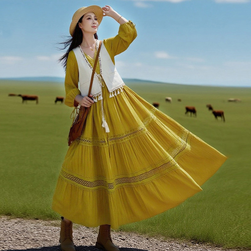 【出游日记】复古大摆连衣裙女秋季2025新款宽松蕾丝拼接荷叶边裙