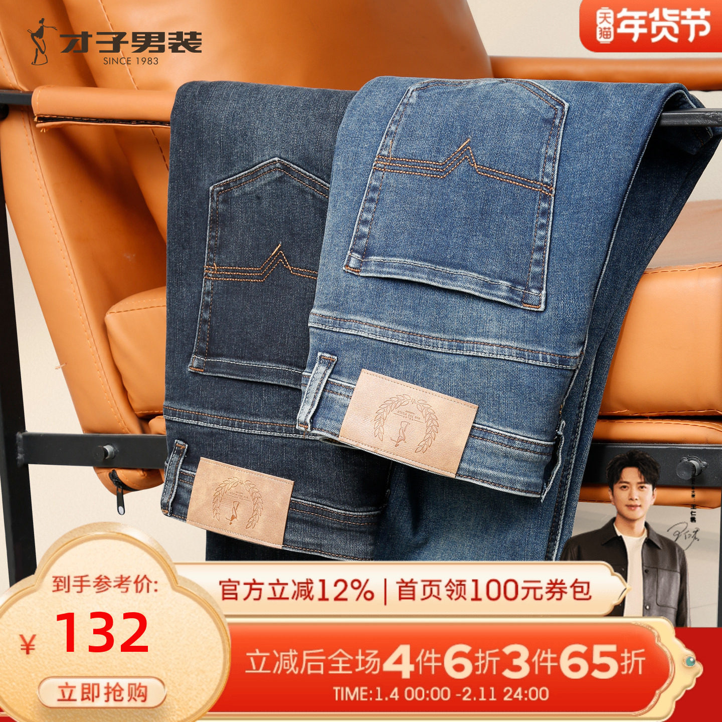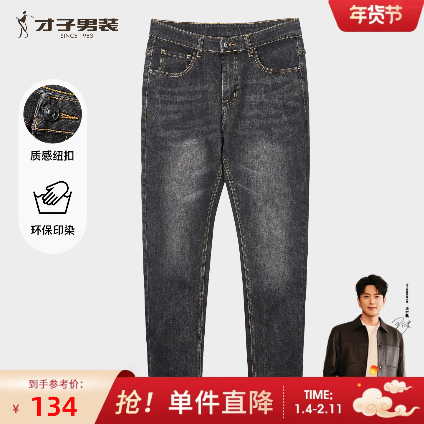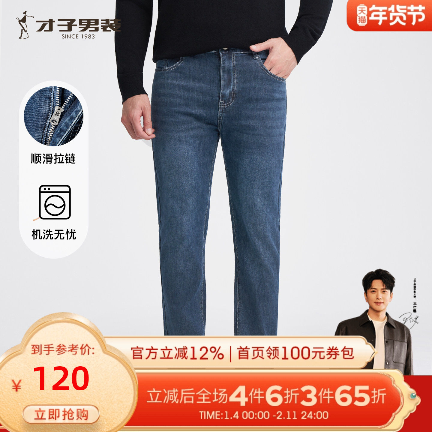 才子男装牛仔裤男士2025秋冬季新款修身直筒水洗原色休闲弹力裤子