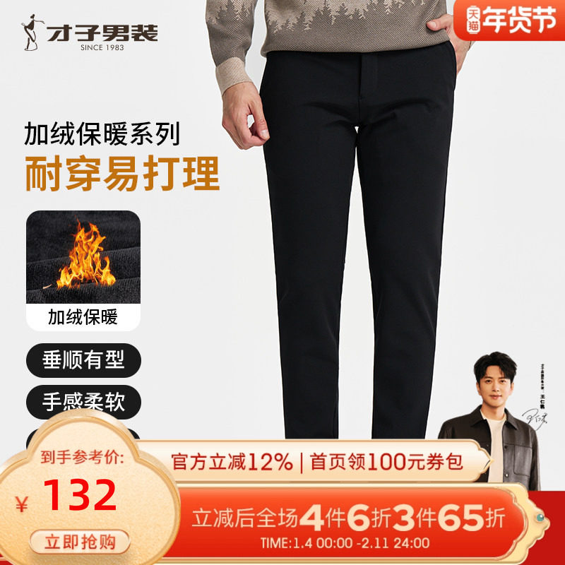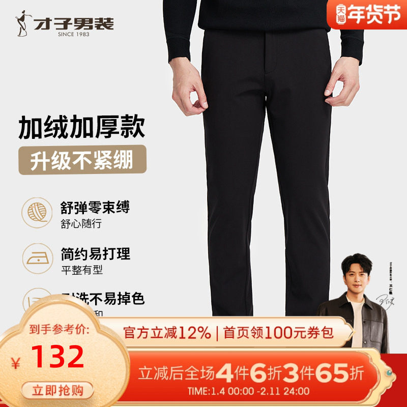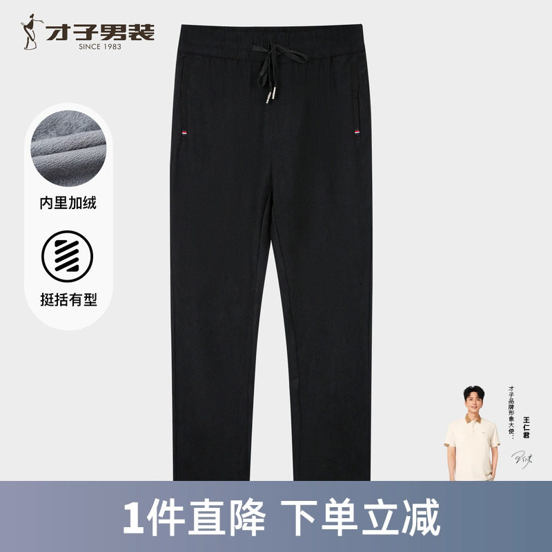 才子男装加绒商务休闲裤男2025秋冬新款修身直筒加厚保暖黑色裤子