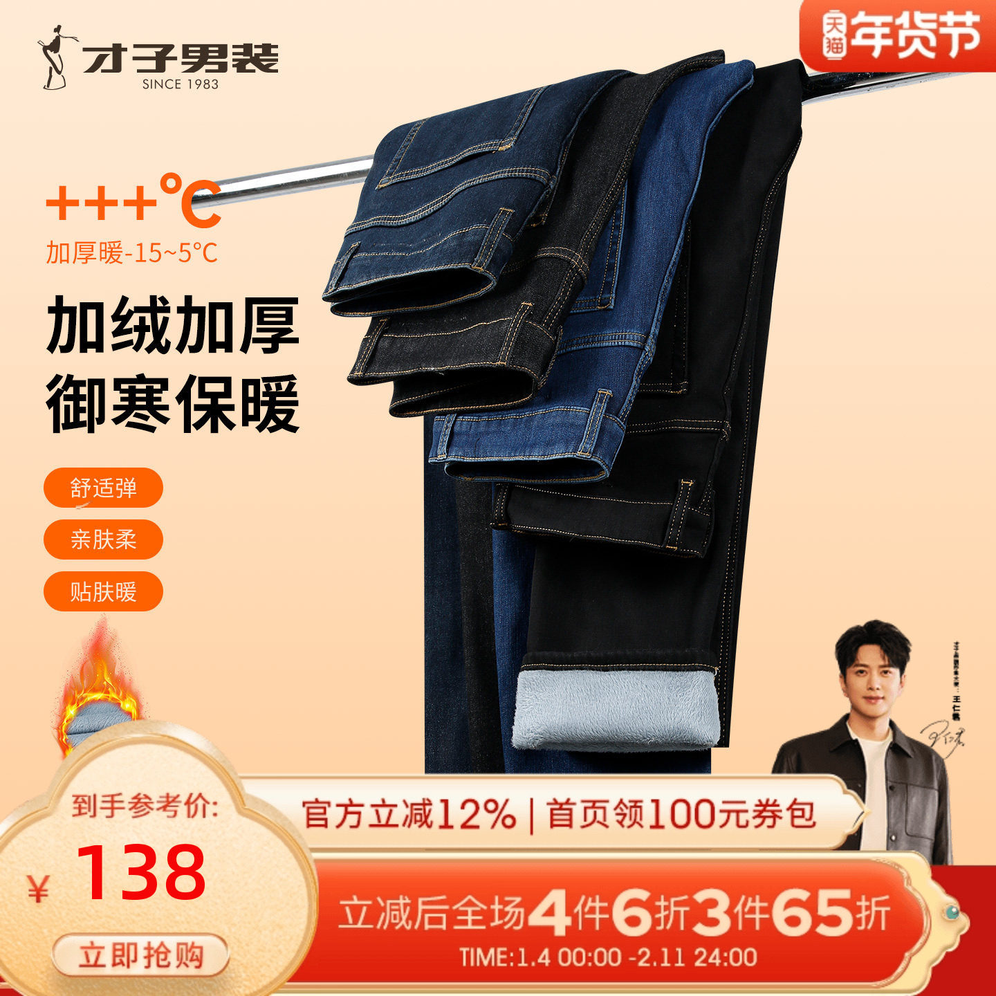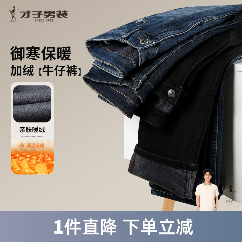 才子男装加绒加厚牛仔裤男2025冬季新款保暖修身水洗休闲黑色裤子