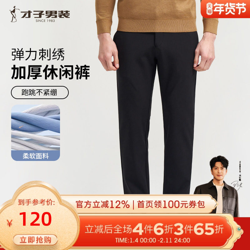 才子男装休闲裤男2025秋季新款保暖修身弹力刺绣厚款黑色商务裤子