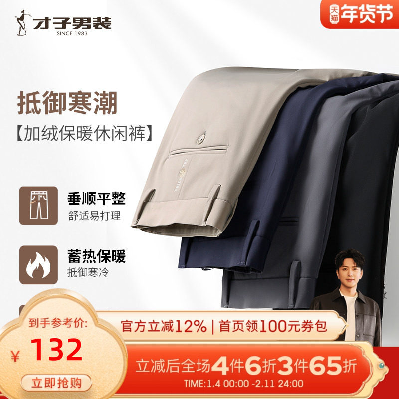 才子男装加绒休闲裤男2025冬季新款修身直筒商务休闲保暖弹力裤子