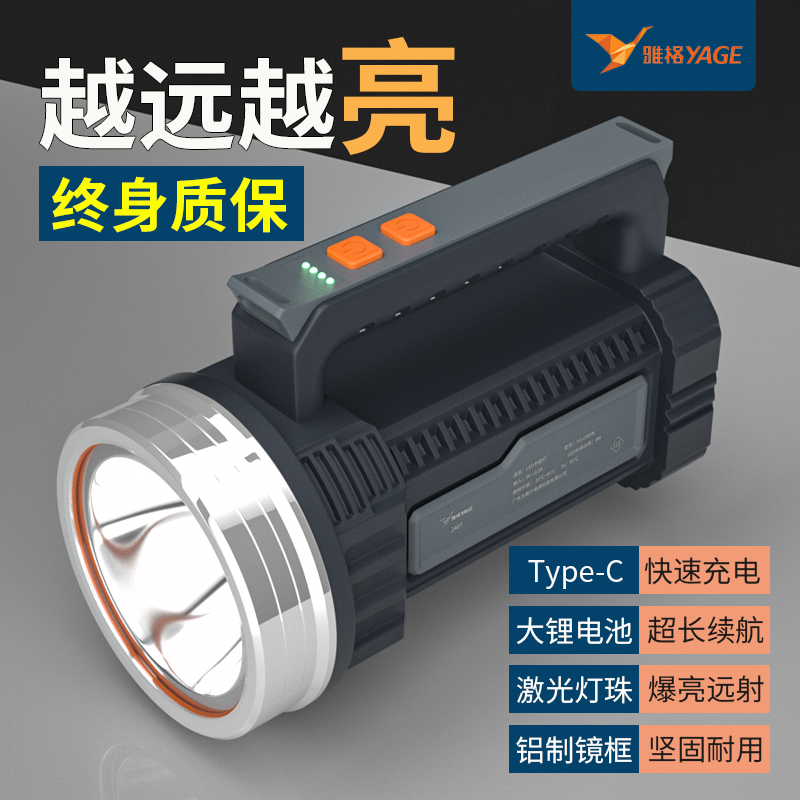 雅格正品高亮强光大手提手电筒锂电池充电工厂巡逻户外照明探照灯