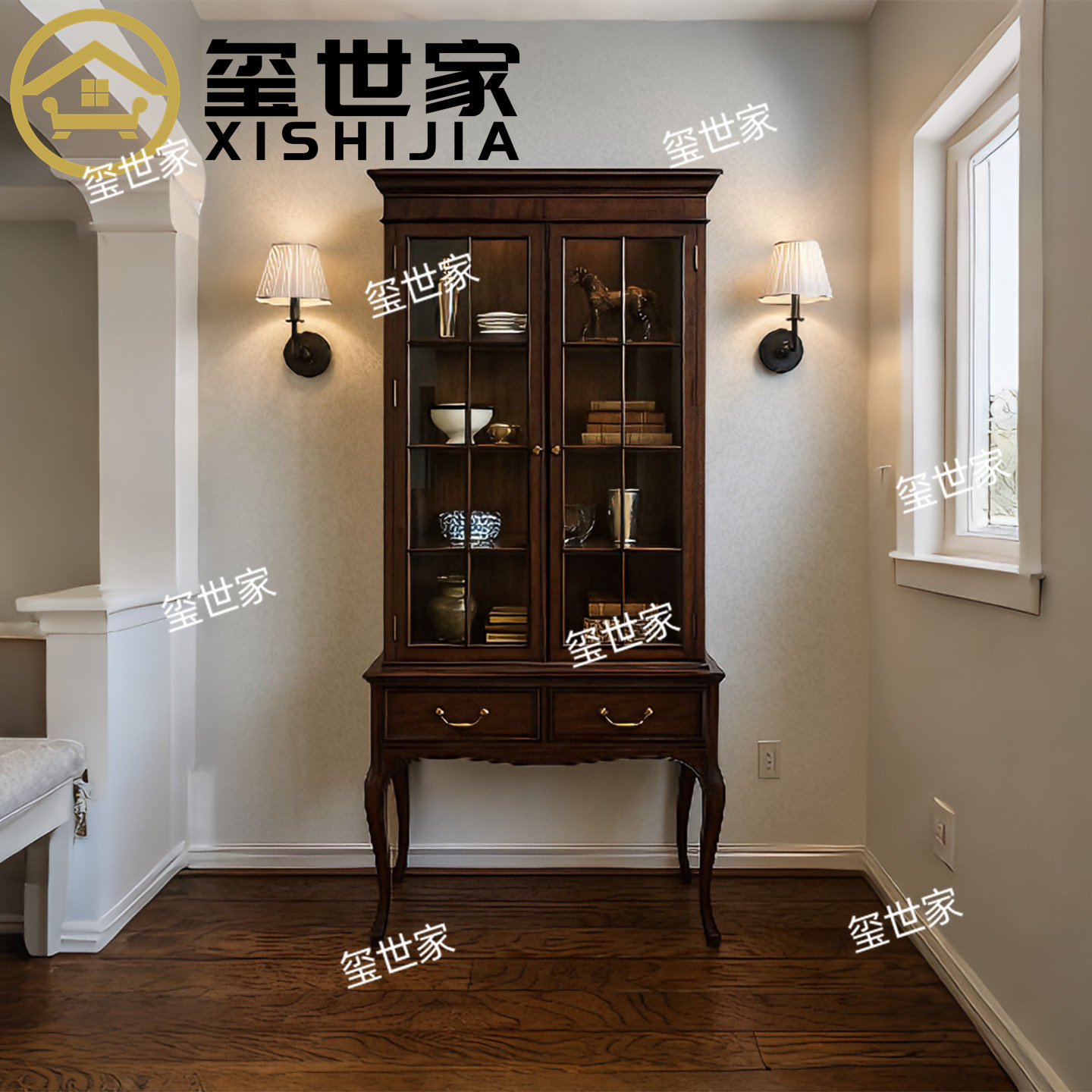玺世家 美式复古实木酒柜 家用书柜 玻璃门展示柜 储物柜 可定制