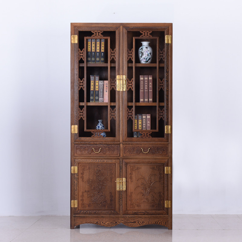 红木家具 鸡翅木书柜 玻璃门双门仿古中式实木书架全实.木书橱组