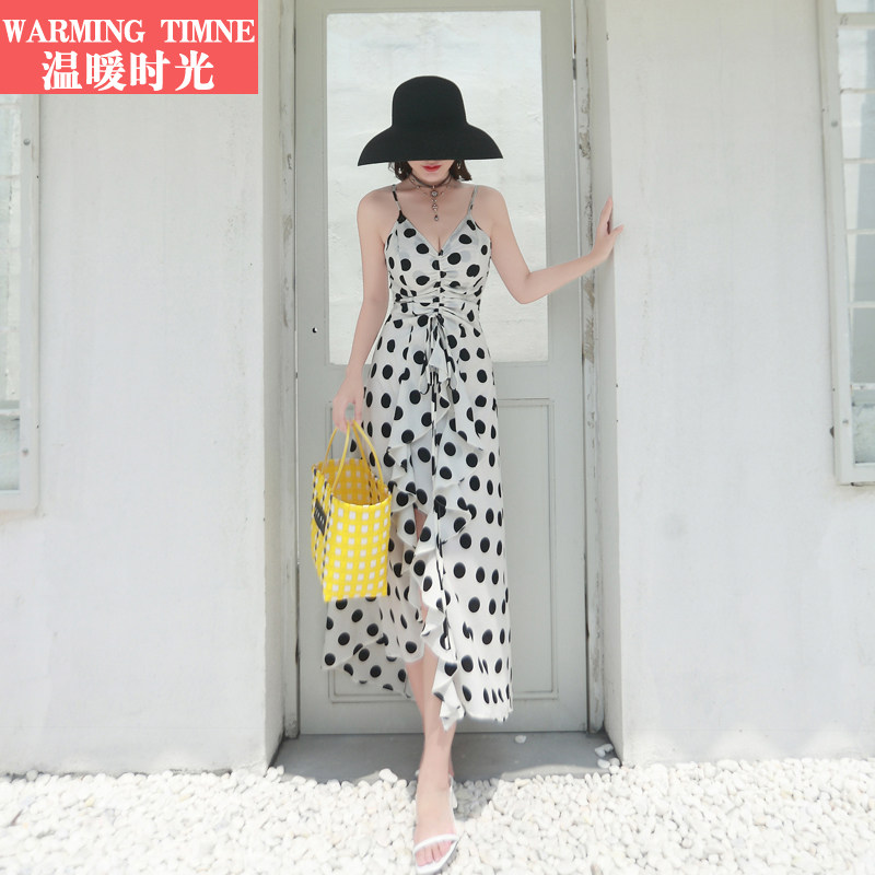 沙滩裙女三亚海边度假泰国显瘦长裙新款法式复古波点吊带连衣裙夏