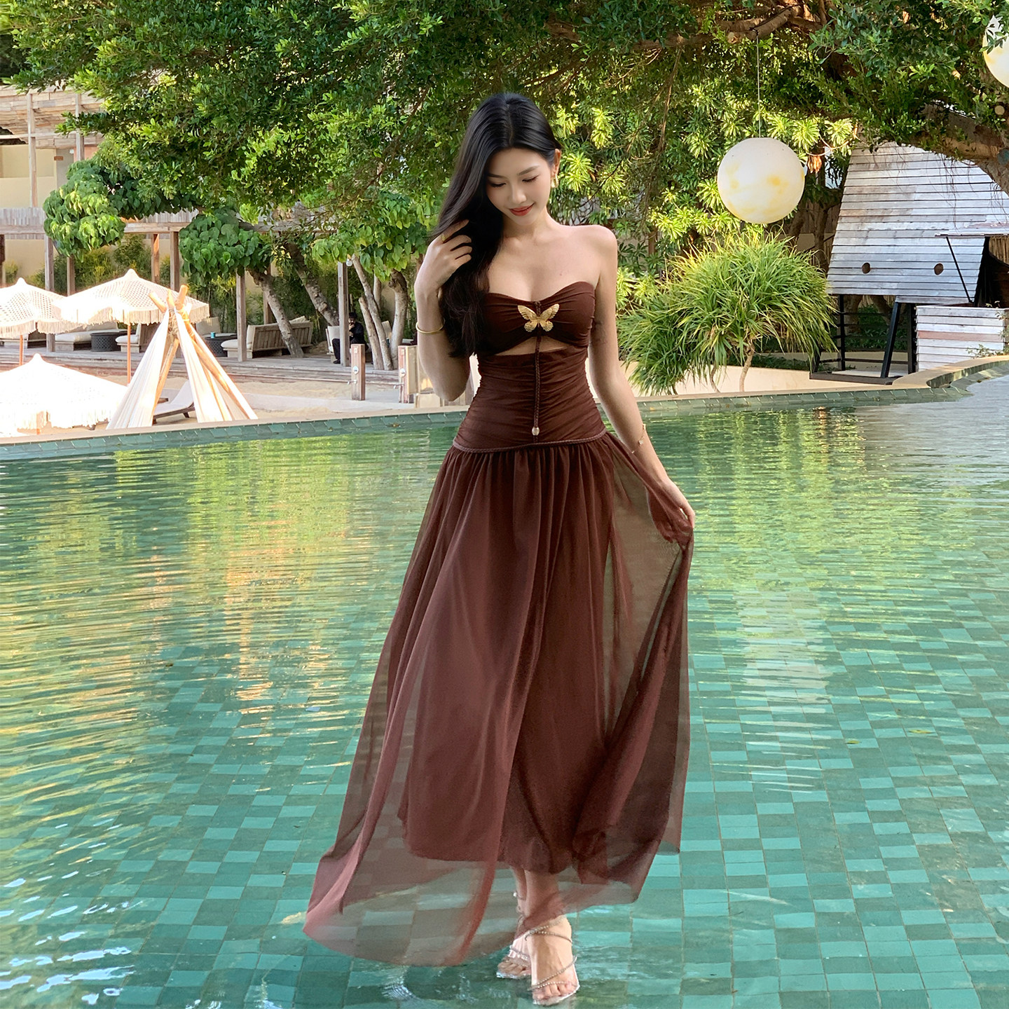 谜思特海洋 爆款新米黄镂空性感显瘦沙滩连衣裙子海边度假 礼裙