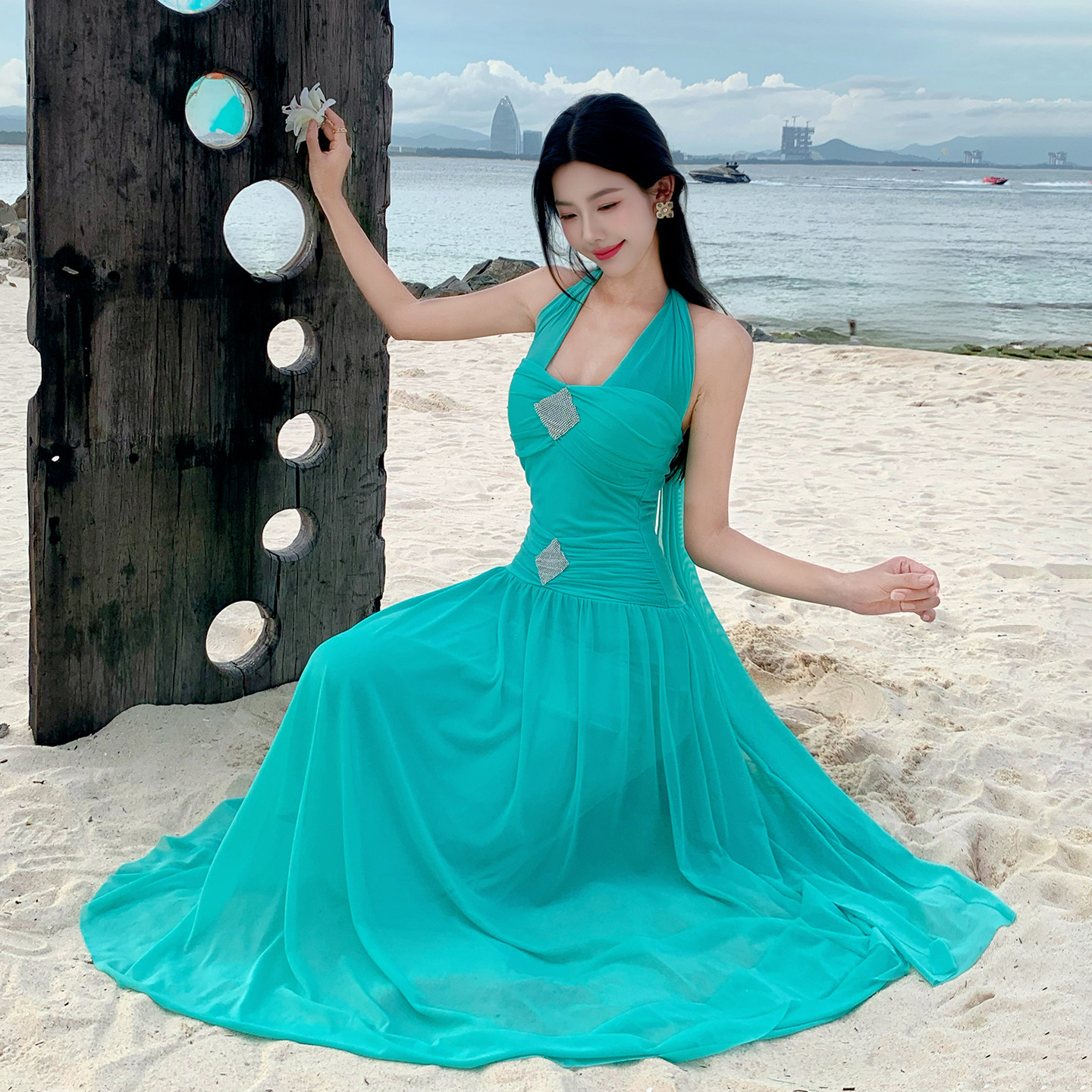 三亚海边度假沙滩裙绝美海岛旅游拍照穿搭绿色挂脖连衣裙收腰显瘦