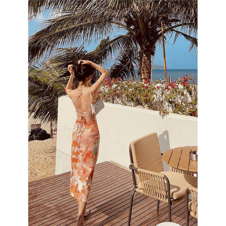 海边度假露背绑带吊带裙女夏新款收腰显瘦性感辣妹别致沙滩连衣裙