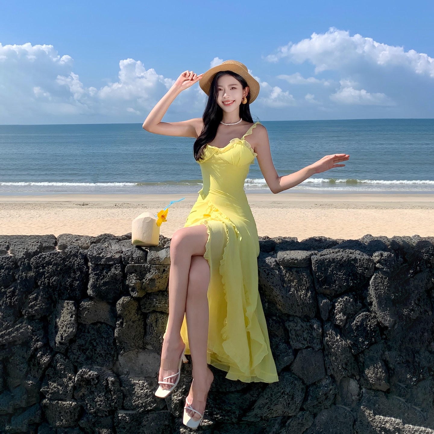 三亚海边绝美穿搭沙滩裙荷叶边收腰显瘦黄色吊带度假连衣裙ootd女