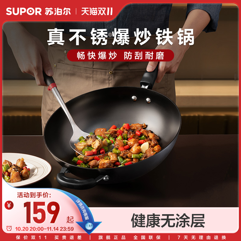 苏泊尔铁锅无涂层老式炒锅家用炒菜锅锅煎牛排煎蛋锅燃气适用不锈