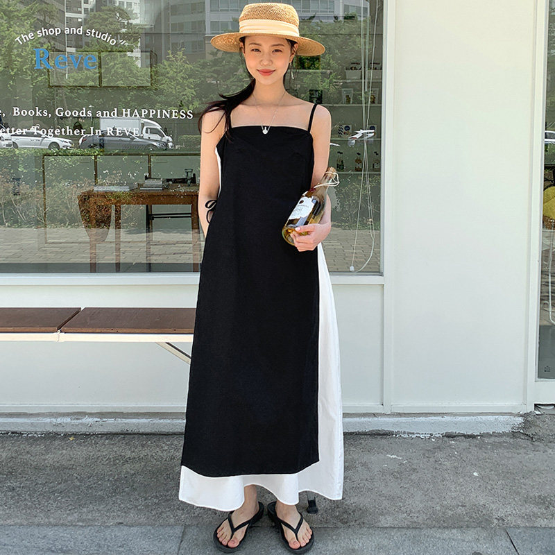 22夏季begin~时尚百搭简约气质淑女范A型宽松撞色吊带连衣裙长款