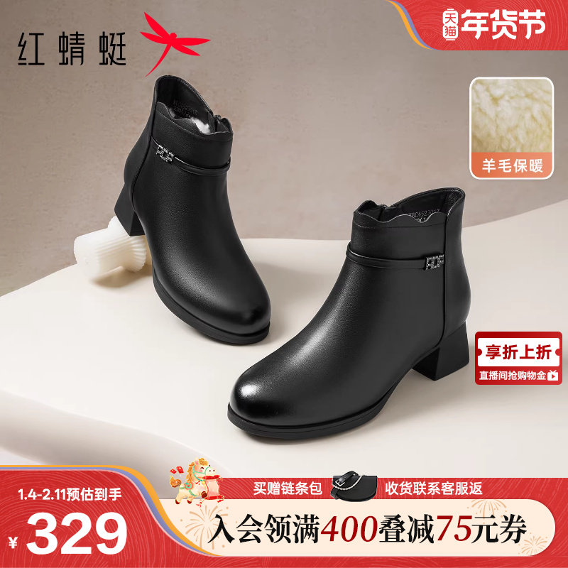 红蜻蜓妈妈鞋子冬季新款女鞋靴子羊皮粗跟皮鞋中年女士真皮高跟靴