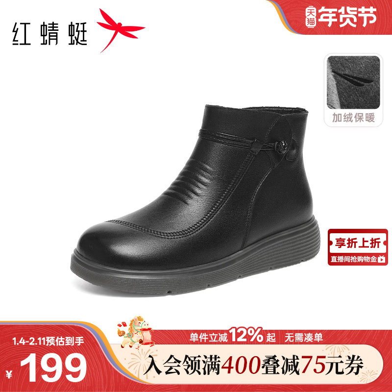 红蜻蜓妈妈鞋子冬季新款女鞋真皮加绒保暖皮鞋女款中老年短靴棉鞋