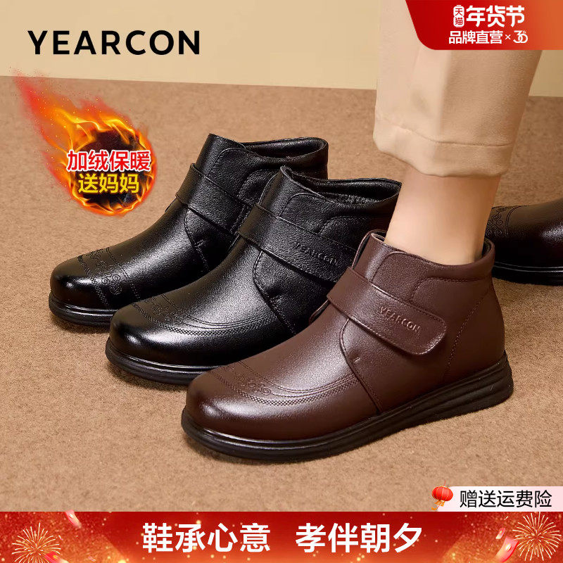 意尔康妈妈鞋子冬季新款加绒加厚软底短靴真皮棉鞋中老年人皮鞋女