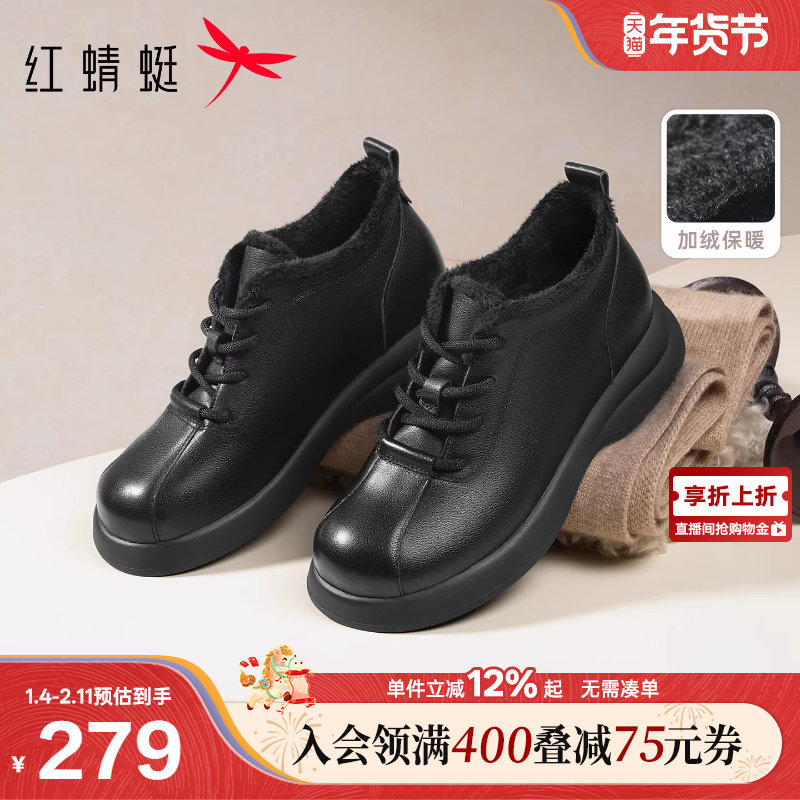 红蜻蜓坡跟妈妈鞋子冬季新款女鞋真皮加绒保暖皮鞋女款中老年棉鞋