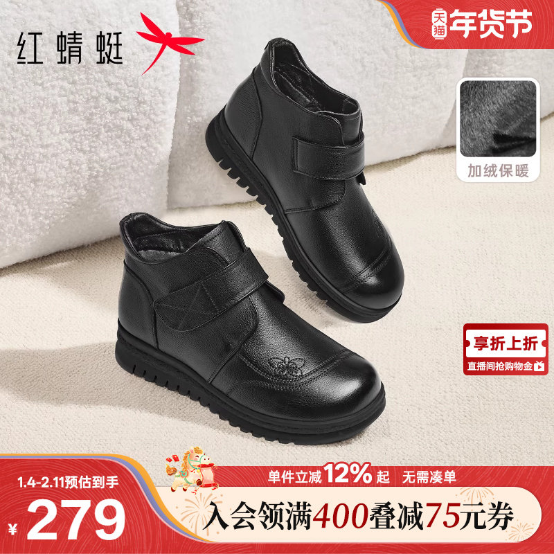 红蜻蜓妈妈鞋子冬季新款女鞋靴子舒适真皮保暖皮鞋女款中老年棉鞋