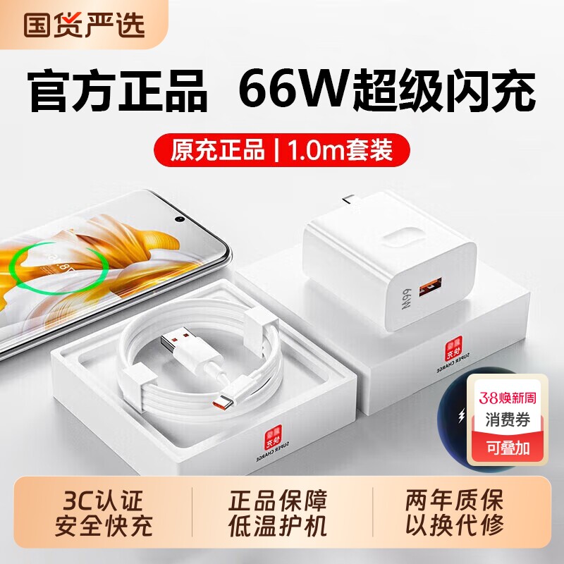 【国家3C认证】66W超级快充头适用华为原装充电器头Mate60pro50荣耀快充超级Nova8/10/手机数据线100W双口头